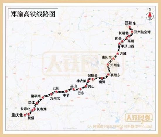 鄭渝高鐵北起河南省鄭州市,南至重慶市,途經(jīng)河南、湖北、重慶三省市,全長1068公里,其中,重慶北至萬州北段、鄭州東至襄陽東段已于2016年和2019年開通。鄭渝高鐵全線開通運營后,重慶至鄭州最快4小時可達,同時大大縮短了重慶到達北京、武漢等城市的時長,有效提升重慶鐵路通道北上、東出能力,有助于發(fā)揮重慶作為一帶一路”和長江經(jīng)濟帶聯(lián)結(jié)點的戰(zhàn)略定位。